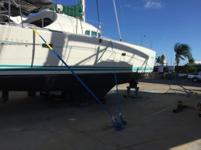 We spent several weeks preparing Zenitude for cyclone season and soon the day came when she was taken out of the water and deposited in her new dry space. All stuff from the deck was then stored away, main sail wrapped around, bimini and jib removed and stored away, The straps to hold her to the ground were installed. Finally, with our bags packed for a season on land we left her there, hoping she doesn't have to face a cyclone.